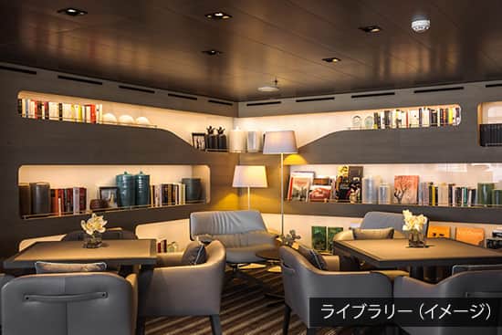 メインラウンジでは音楽とともに優雅なひとときをお過ごしいただけます。パノラミックラウンジにはライブラリーを併設。流れゆく景色とともに静かなひとときを。