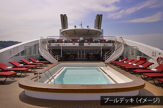 航行中はプールデッキからの眺望をお楽しみください。晴れた日には船長主催のカクテルパーティーが開かれることも。海風を感じるオープンエアバーもございます。
