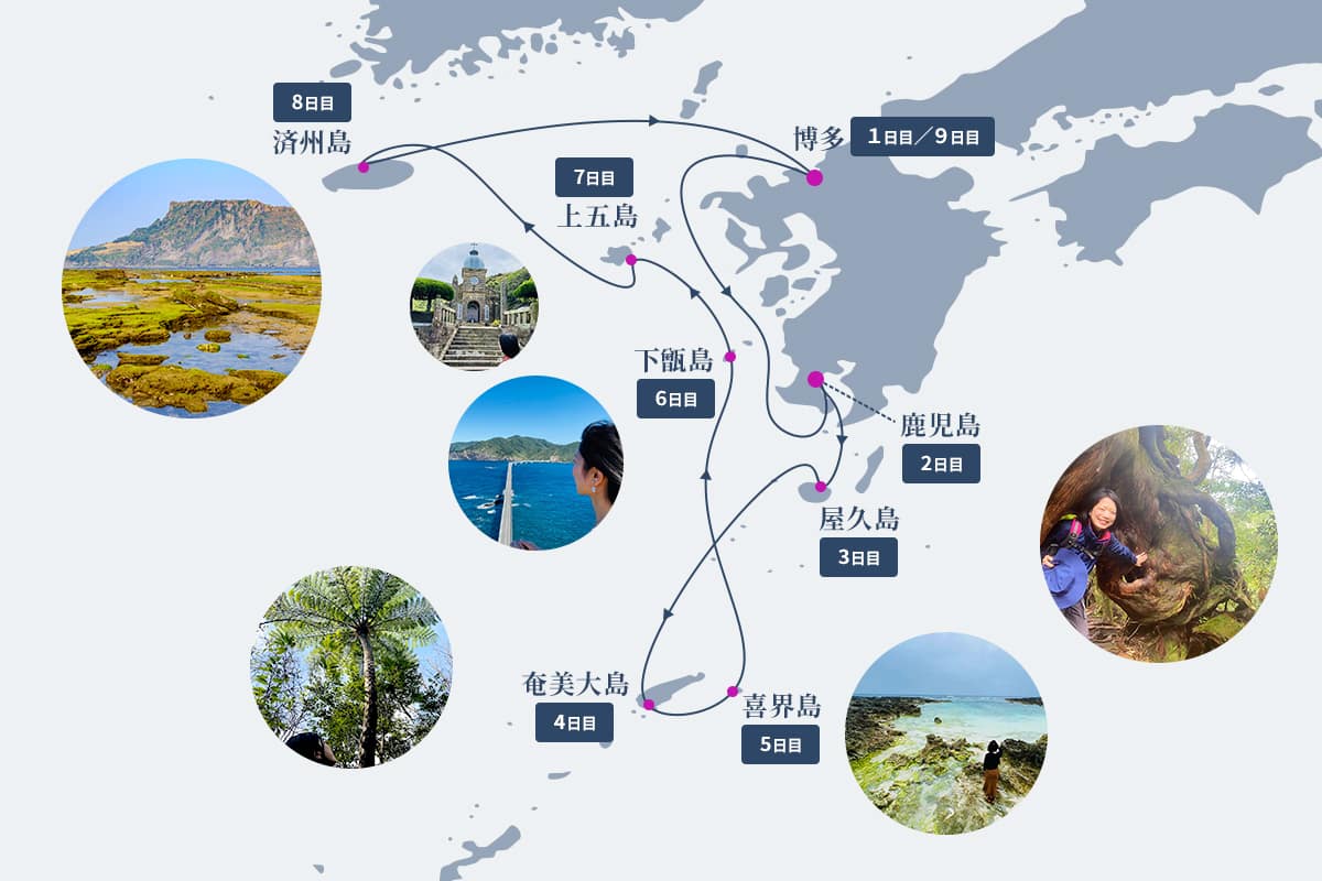 世界自然遺産に登録されている屋久島、奄美大島をはじめ、固有の文化が守り伝えられ豊かな自然が残る美しい島々をめぐります。