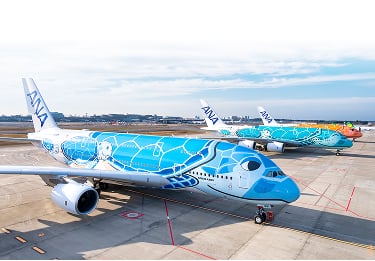 ゲートであなたを待つのは、ウミガメのデザインがされた飛行機エアバスA380型機「FLYING HONU」。