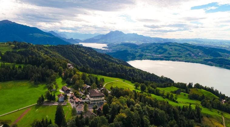 チューリッヒ空港から車で1時間の街ツークの丘の上にキャンパスがあります。キャンパスからはツーク市街やツーク湖を見下ろせます。登山電車の終着駅があり、生徒は街の喧騒と遮断された山頂での生活を楽しみます。キャンパスからの素晴らしい眺望を楽しめます。