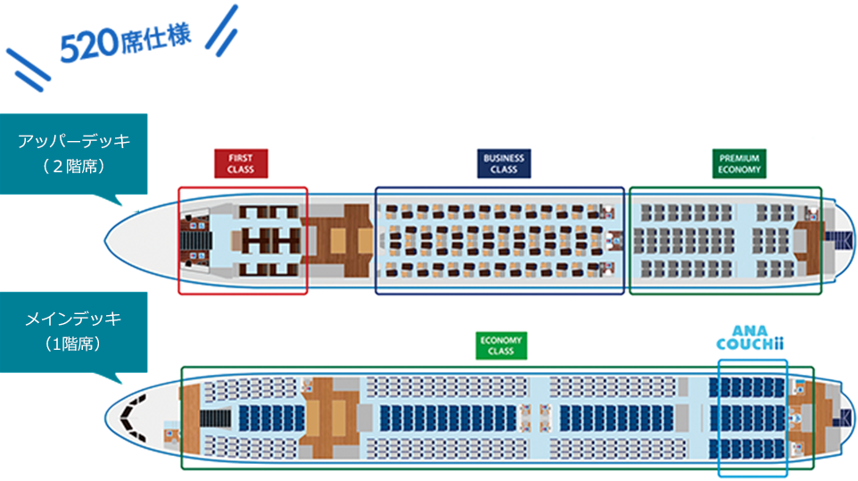 ファーストクラス8席、ビジネスクラス56席、プレミアムエコノミー73席、エコノミークラス383席の520席仕様です。