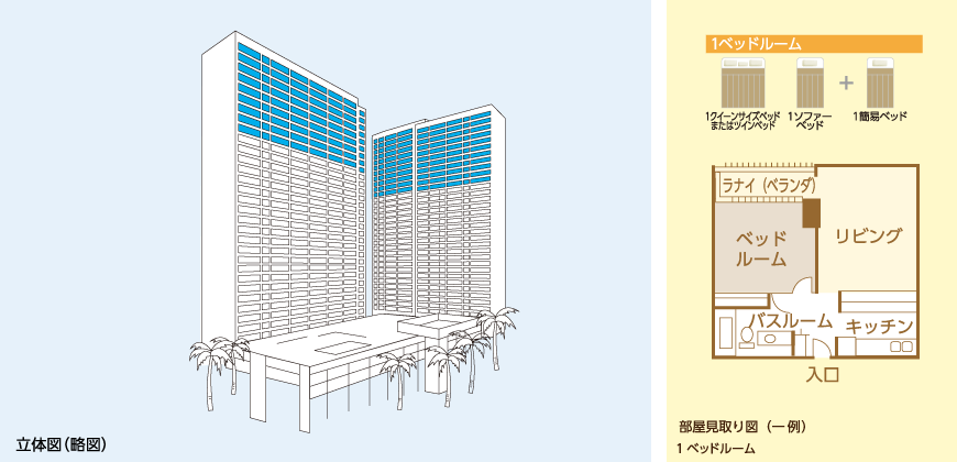 | ワイキキタワー 部屋指定なし ベッド1台 | 約32㎡(ラナイ含む) | 1~3名 | |