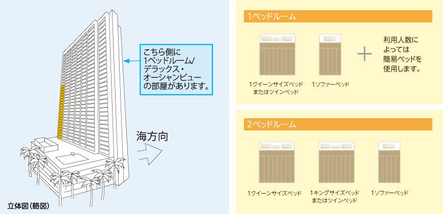 | ワイキキタワー 部屋指定なし ベッド2台 | 約32㎡(ラナイ含む) | 1~3名 | |