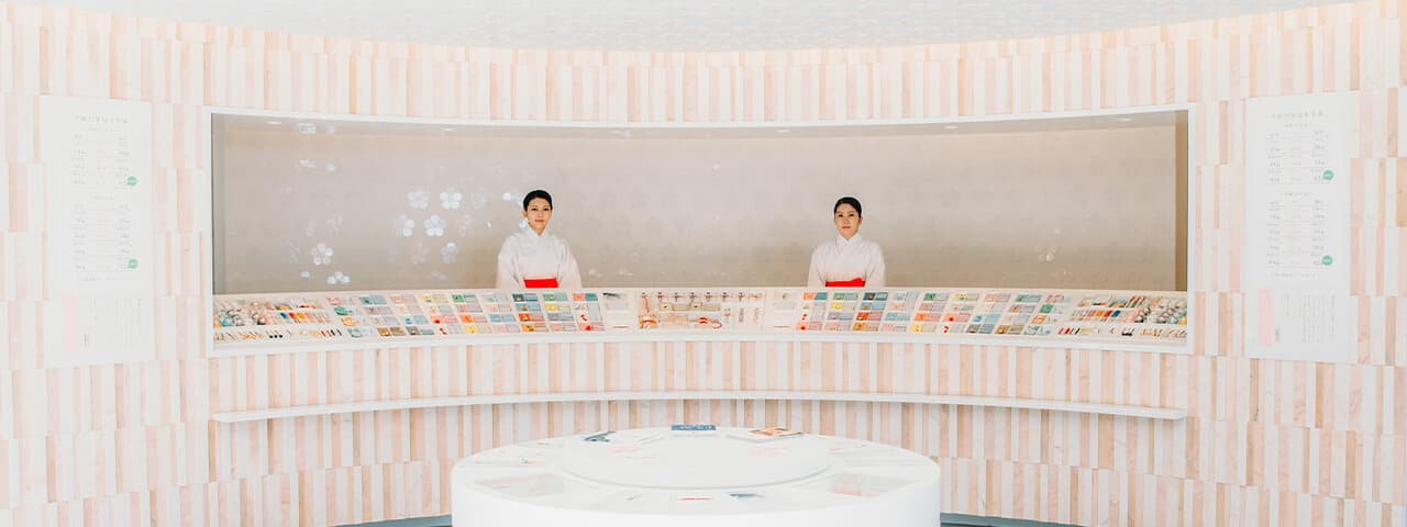 「100年後のスタンダード」をテーマに2012年に新築された社務所は、伝統的な技法と現代的なデザインが融合した空間になっています。特にお札お守り授与所は、世界的なインテリアデザイナーのWonderwall片山正通さんが手掛けたことで話題を集め、「清潔感」と「可愛らしさ」を感じさせる設計になっています。壁に張り巡らされたピンク色の大理石は、参拝されるお一人お一人の願いを表現しており、天井や壁には御神紋である桜のモチーフが張り巡らされ、外の景色が映り込むことでその時々の季節の情景を部屋の中に取り込んでいます。「縁結び」をはじめ様々な願意のカワイイお守りが並べられ、どのお守りにするか迷うほど。