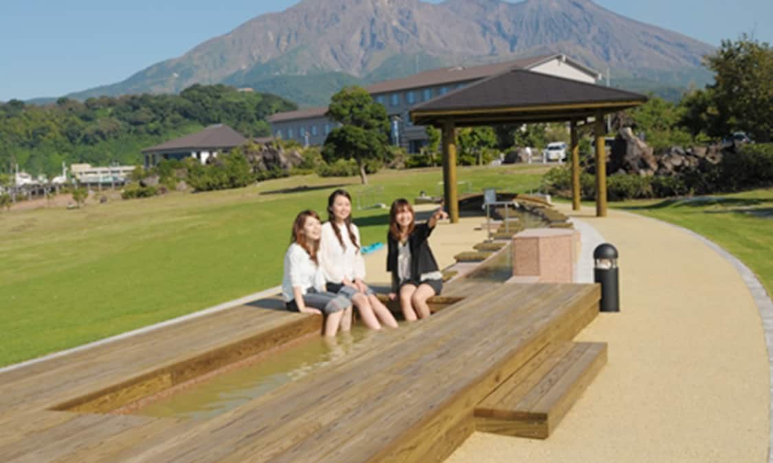 桜島フェリーターミナルから徒歩10分の海辺の公園。公園内には全長約100mと日本最大級の足湯があり、ゆっくりと錦江湾や鹿児島市街地の風景を楽しむことができます。