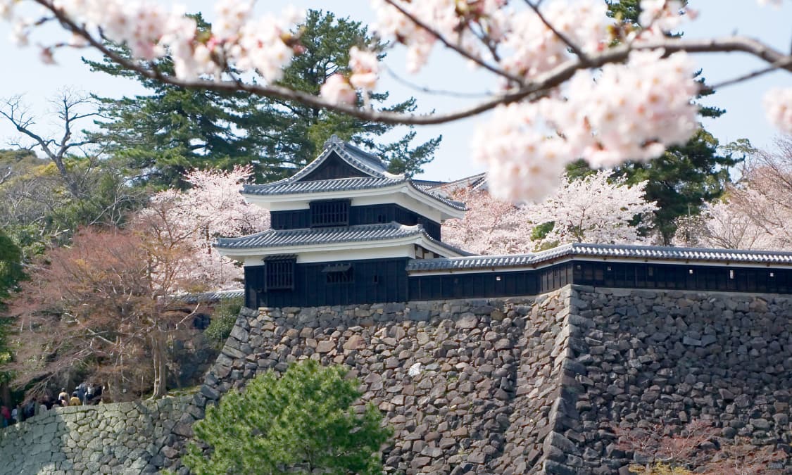 松江市の街並みや宍道湖を一望できる松江城の天守は、日本に現存する12天守のうちの一つです。姫路城が「白鷺城」と呼ばれるのに対し「千鳥城」とも呼ばれる松江城は、質実剛健な構えが特徴的です。また、春・桜の季節には約200本の桜が園内に咲き誇ります。