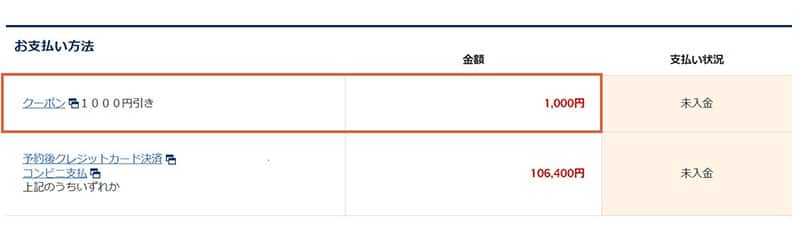 申し込み内容確認画面の「お支払い方法」欄にクーポン内容が反映されていることを確認し、予約を完了します。