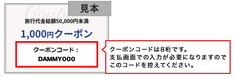 クーポンは旅行代金の支払いの一部としてご利用できます。なお、旅行代金は代表者に一括して請求いたします。
