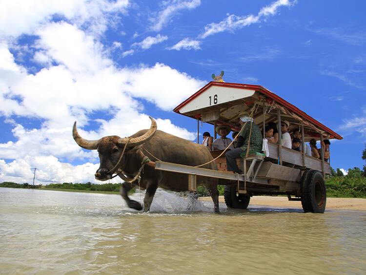 由布島は島の周囲約2.1Km、海抜1.5mというとても小さな島です。由布島と西表島の間の海は約400m、遠浅で満潮時でも1mほどにしかなりません。潮風を感じながら水牛車に揺られて海を渡る、ここだけの貴重な体験をお楽しみください。