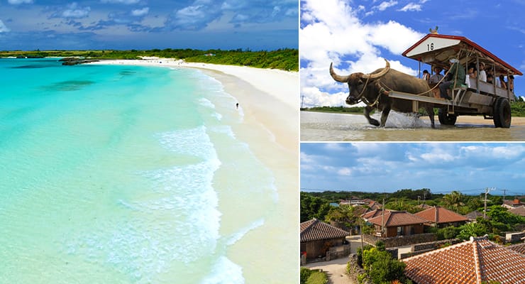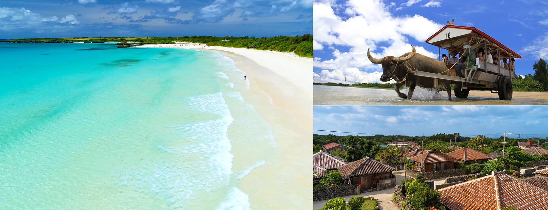 左:渡口の浜(とぐちのはま)/宮古島 (Copyright:OPG) 右上:由布島の水牛車 右下:竹富島集落(Copyright:OPG)