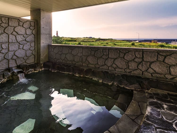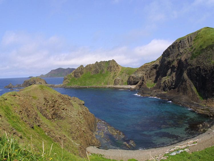 ぐるりと弧を描いた美しい入り江の先端の岬は、その名前の通り海の底が透けて見えるほど透明度が高く、太陽の光で微妙に色が変わります。気象状況によっては「レブンブルー」と呼ばれる翡翠色の海を見ることができます。