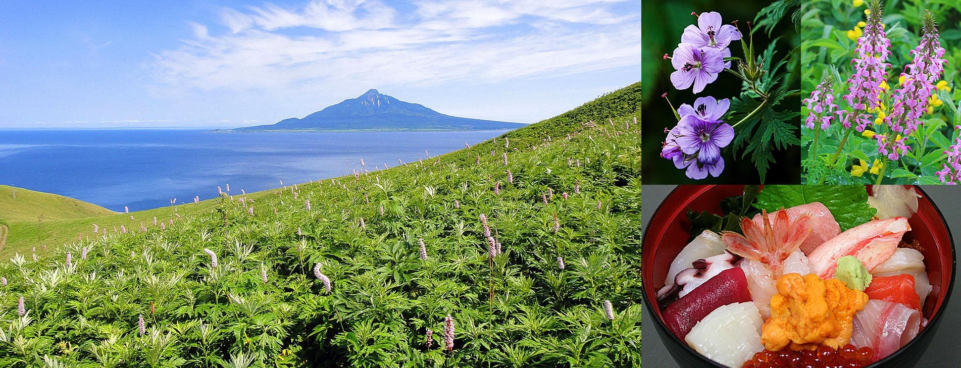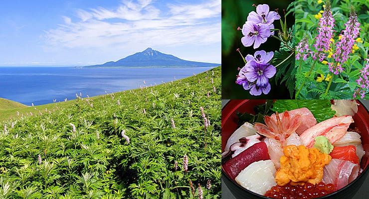 左:桃岩展望台から見た利尻山(7月頃) 右上:チシマフウロ/レブンシオガマ(7月頃) 右下:海鮮丼