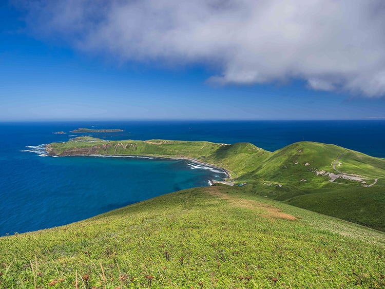 礼文島の最北端の岬は、海岸の断崖がそのまま岬になった島一番の景勝地。広がる大海原の正面には「海馬島」、対岸には金田ノ岬を望むことができます。晴れた日には、遠くにサハリンが見えます。