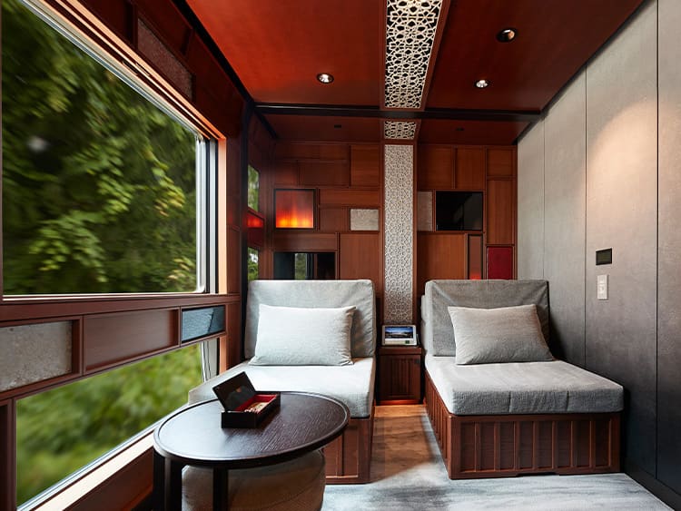 空に向かって枝を伸ばす樹木をイメージさせる、洗練されたラウンジ。窓からはその名の通り「こもれび」を思わせる光が注ぎ、夜には月明かりに照らされた風景が流れていきます。車外での観光時を除き、お好みのお飲み物や軽いお食事などをお楽しみいただけます。