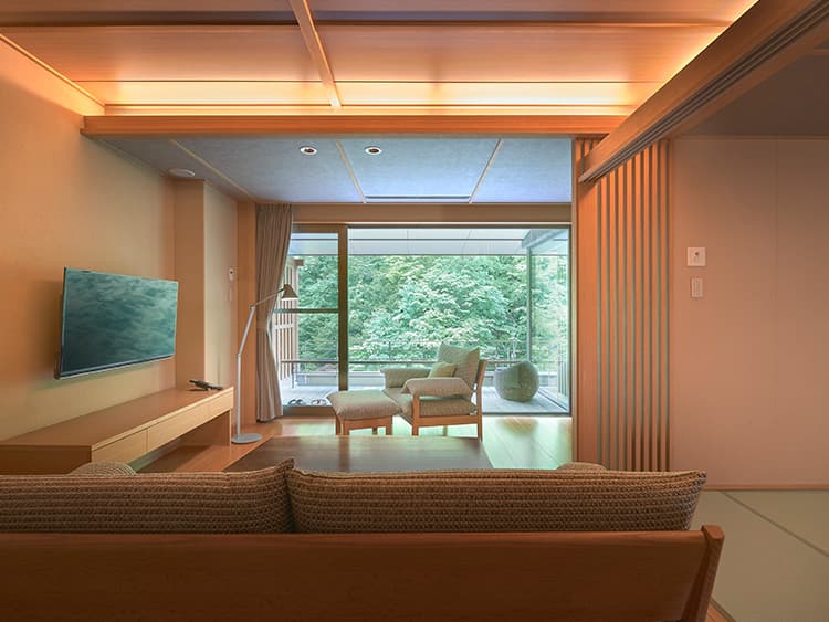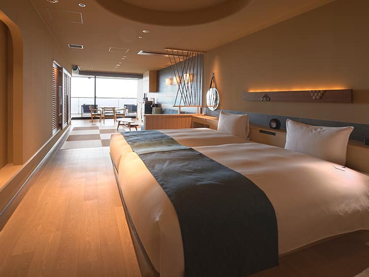 支笏湖を望んで立つ「碧の座」。靴を脱ぎ畳の廊下を歩く和の佇まいもありながら、洋の快適性も併せ持つホテルです。全室に広々とした温泉露天風呂とジェットバス付の内湯を備え、まるで別荘を訪れたかのようにゆったりとお寛ぎいただけます。