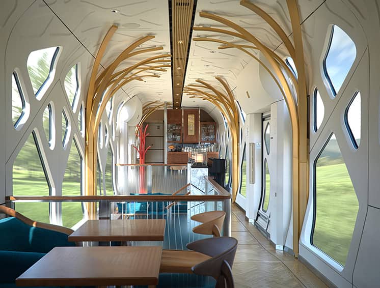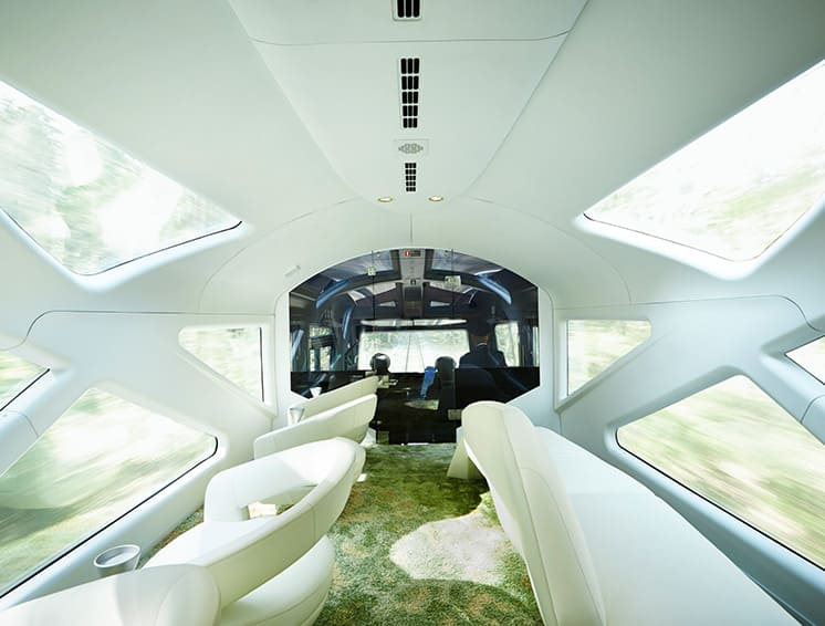 先頭車両と最後尾車両はいずれも展望車両。車窓をダイナミックに流れる景色をお楽しみいただけます。未来へ進む意志を表現した、白い壁と光のかけらのような窓、苔を思わせる絨毯。立っていても、座っていても、窓の外をダイナミックに流れる自然の景観が楽しめるデザインです。