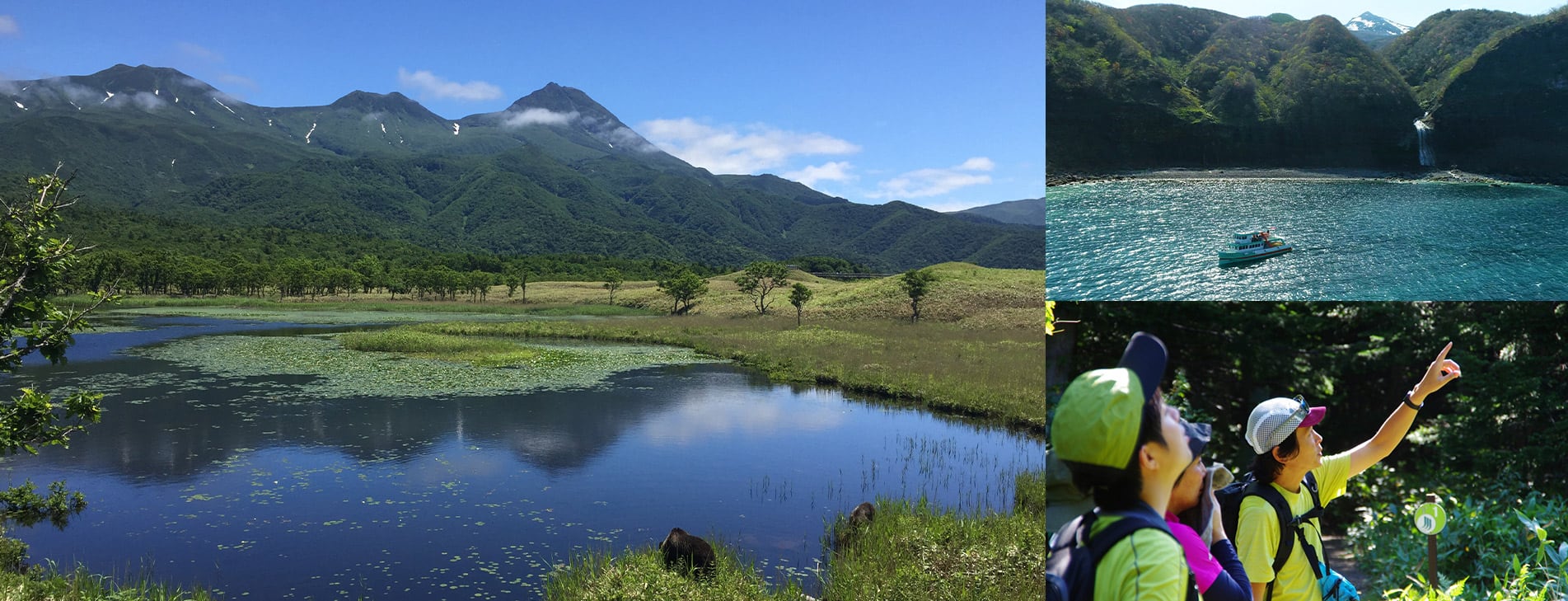 左:知床ガイドウォーク(7月)、右上:カムイワッカの滝 右下:フレペの滝ガイドウォーク