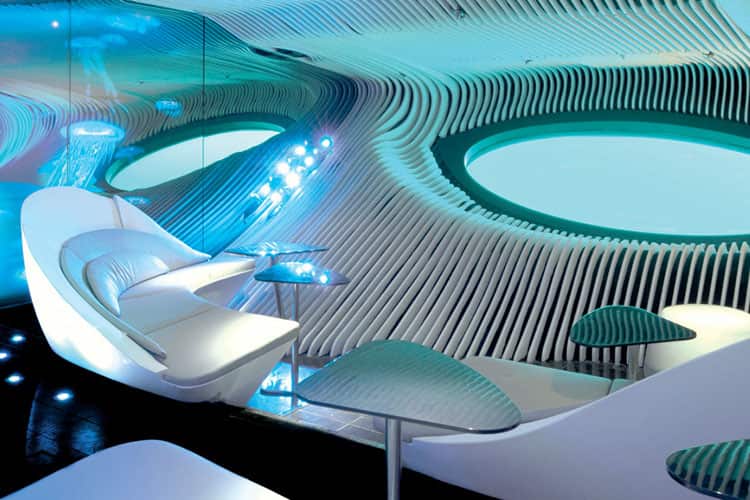 世界で初めて壁面に設置されたスクリーンで海中の映像を見ることができるという未来的なラウンジを体感できます。