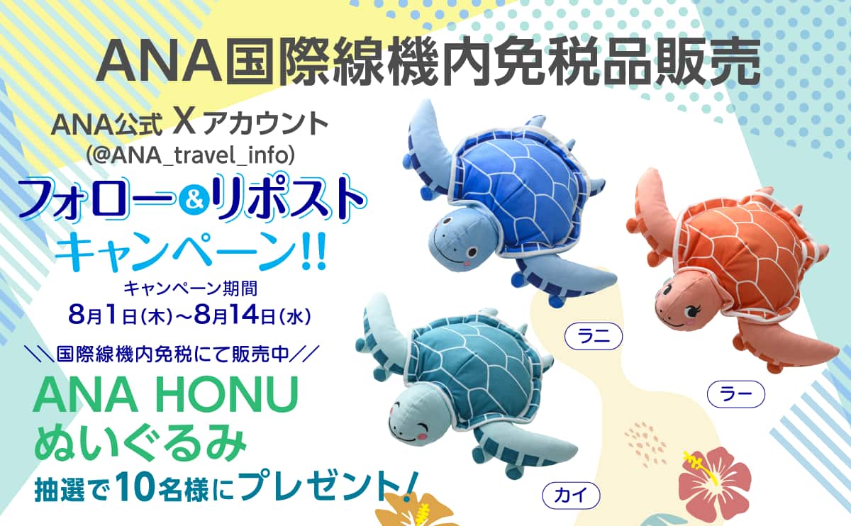 対象期間中に、ANA公式 X アカウント「ANA【公式】@ANA_travel_info」をフォローし、キャンペーンポストをリポストしたお客様の中から抽選で、ANA HONU ぬいぐるみ(ラニ・カイ・ラーいずれか一色をお選びいただけます)を10名様へプレゼント。詳しい応募条件は「応募条件・お申し込みSTEP」に記載。