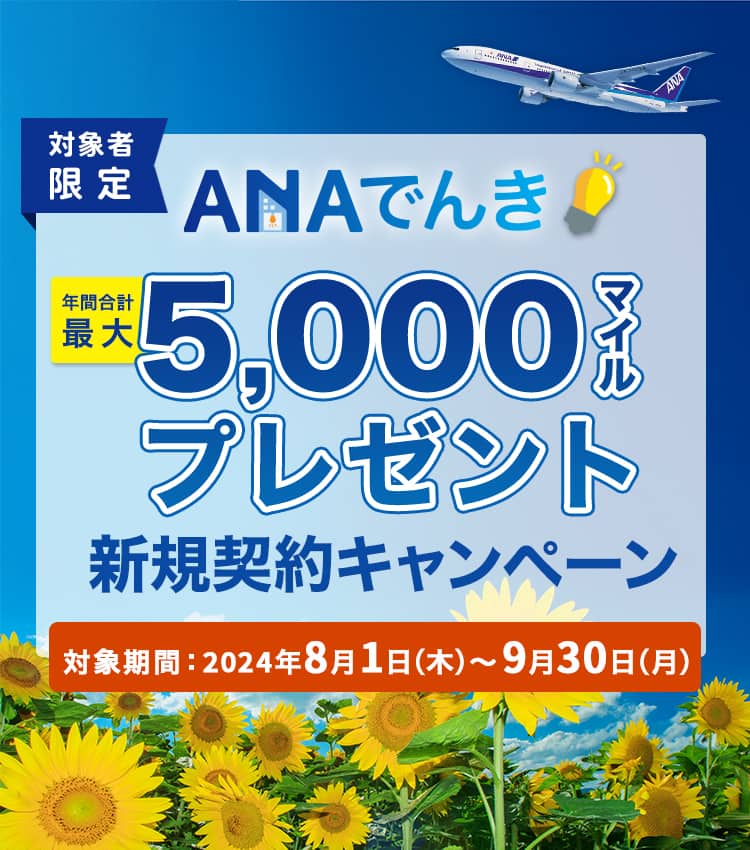 年間合計最大5,000マイルとは、ANAでんき新規契約キャンペーン特典1,000マイルと、対象者限定の本キャンペーン特典400マイル、契約継続の場合に毎月積算される300マイル(ANAカード会員特典)の年間合計3,600マイルの合算したマイル数になります。