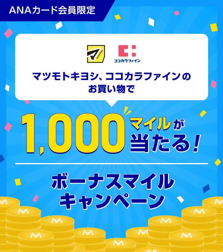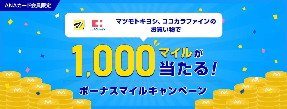 期間中に参加登録のうえ、マツモトキヨシグループ・ココカラファイングループの各店舗で1,000円以上をANAカードで決済いただいた方の中から、1,000円を一口とする抽選で合計200名様のお客様にボーナスマイルをプレゼントいたします!