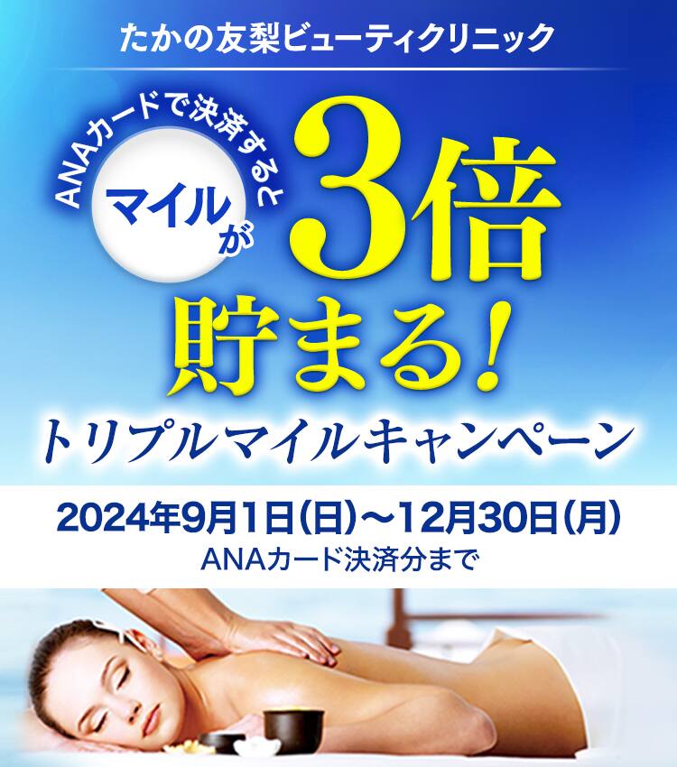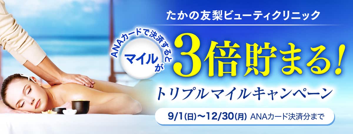 期間中、“たかの友梨ビューティクリニック”にてANAカードでクレジット決済いただくと、クレジットカード会社のポイント移行とは別に、さらに100円(税込)につき3マイル(通常1マイル)をプレゼント!