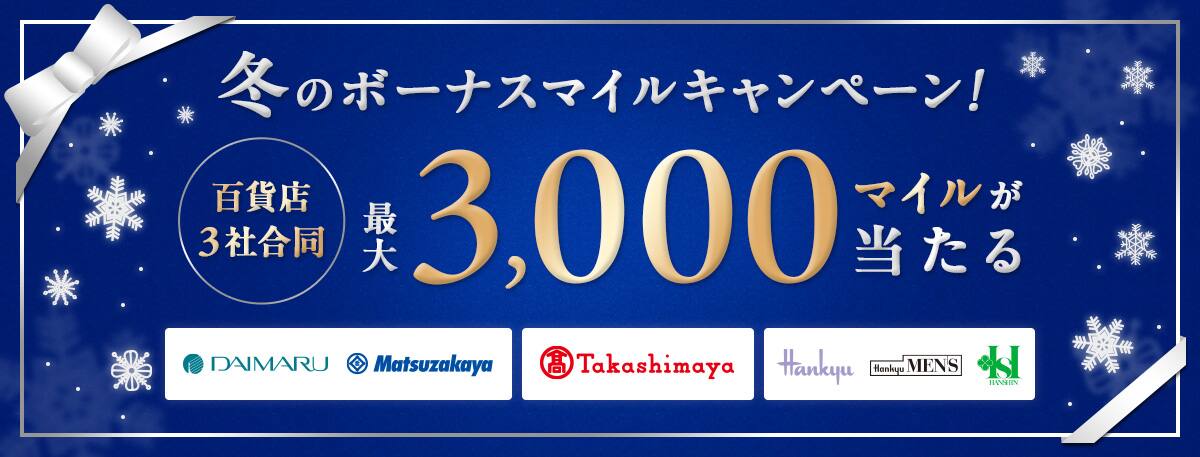 対象期間中に参加登録のうえ、対象百貨店の店舗・オンラインストアにて合計20,000円以上をANAカードで決済いただいた方の中から、20,000円を1口とし抽選で合計500名のお客様にボーナスマイルプレゼント。口数が多ければ当選確率アップ。