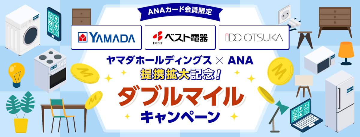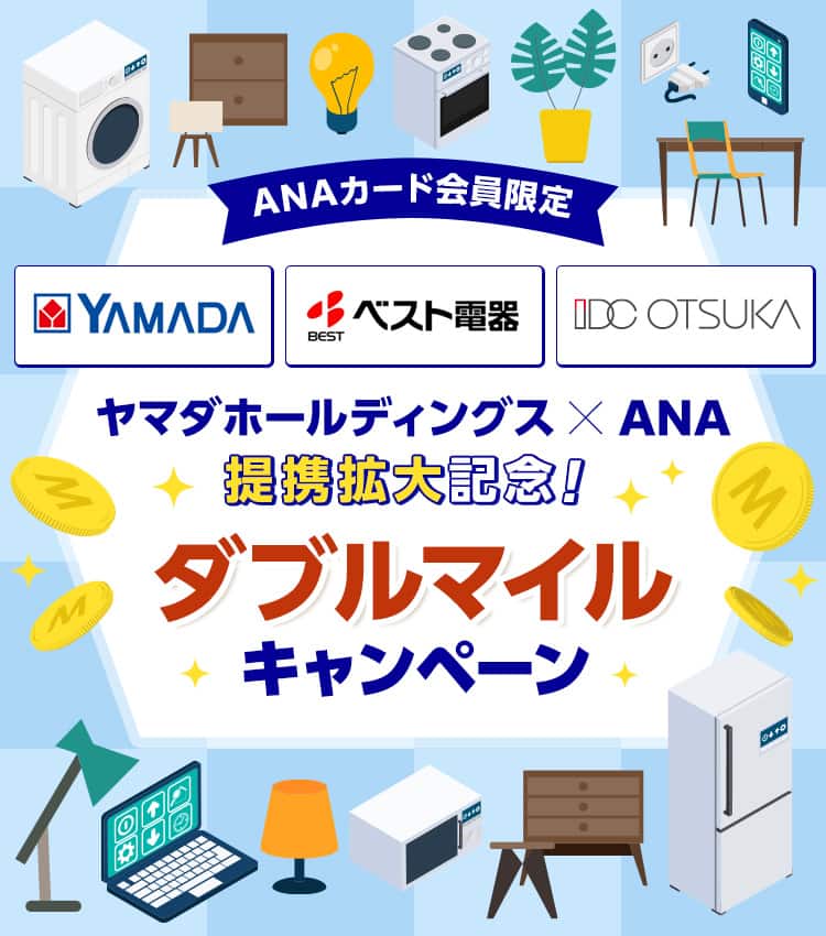 2024年10月1日より、ヤマダデンキLABIに加えて、新たにLIFESELECT、テックランド、家電住まいる館、web.com店、ベスト電器、IDC OTSUKAでもANAのマイルが貯まります!