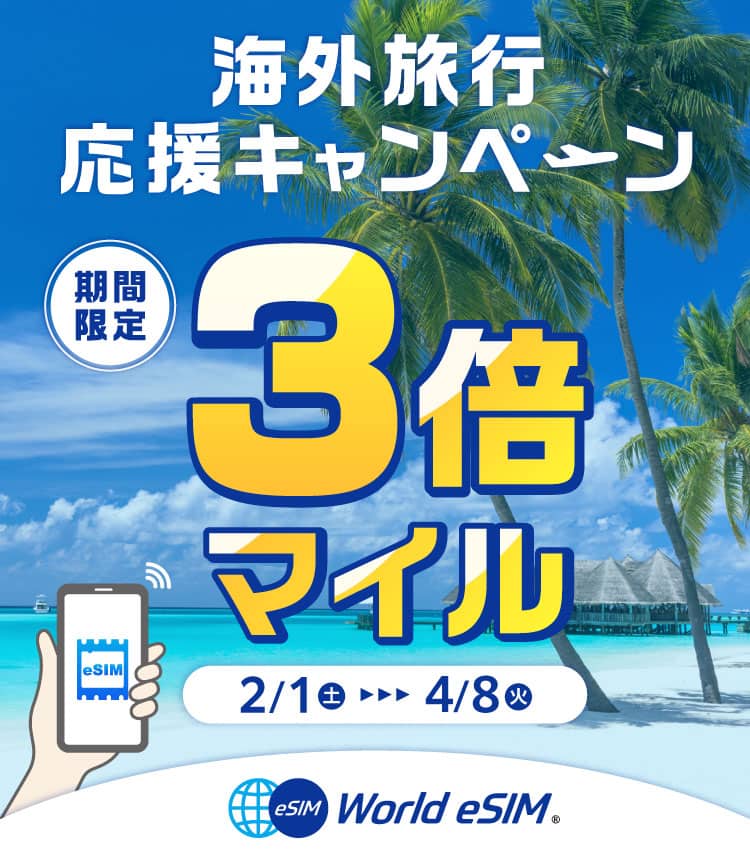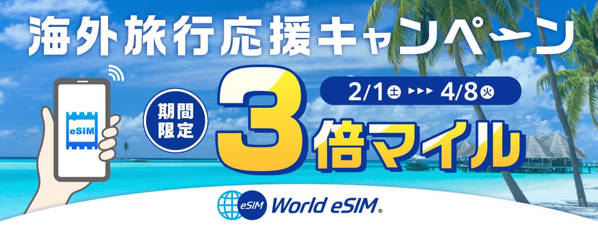 期間中、専用ページからeSIMをご購入いただくと、通常100円(税込)で1マイルのところ3マイル貯まります。