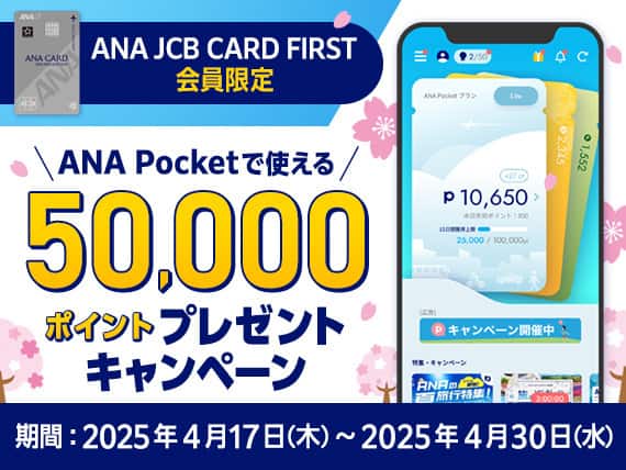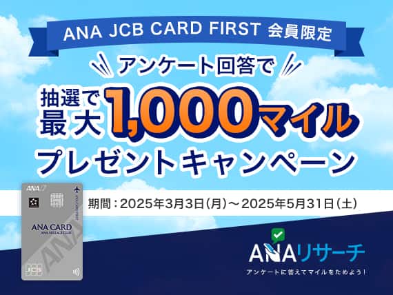 対象期間中にANA JCB CARD FIRSTにご入会後、キャンペーンに参加登録のうえ10万円以上をご利用いただくともれなく10,000マイルプレゼント!
