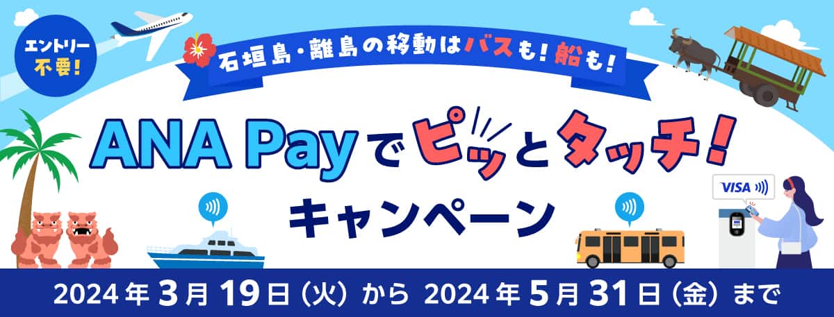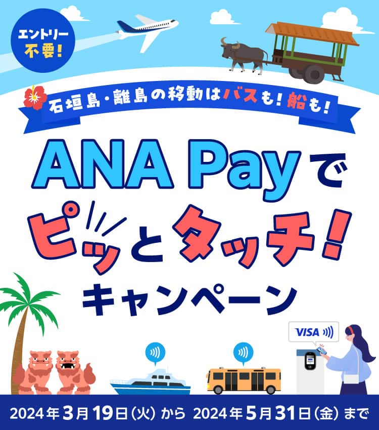 石垣島・離島(八重山エリア)の移動にて、ANA PayのVisaのタッチ決済を利用して対象の公共交通機関にてお支払い、条件を達成した方へキャッシュバック、プレゼントいたします。