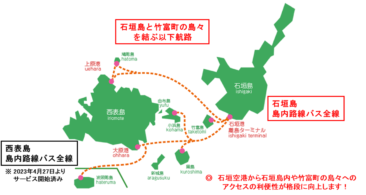 東運輸、西表島交通、カリー観光が運行する路線バス全線、安栄観光、八重山観光フェリーが定期船を運航する全航路