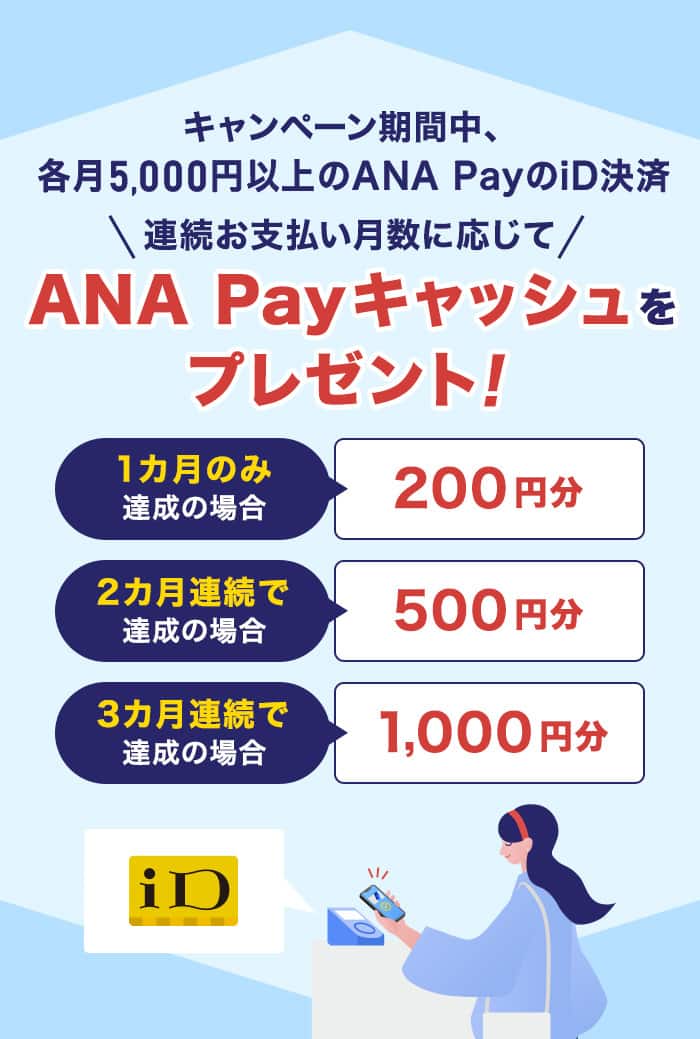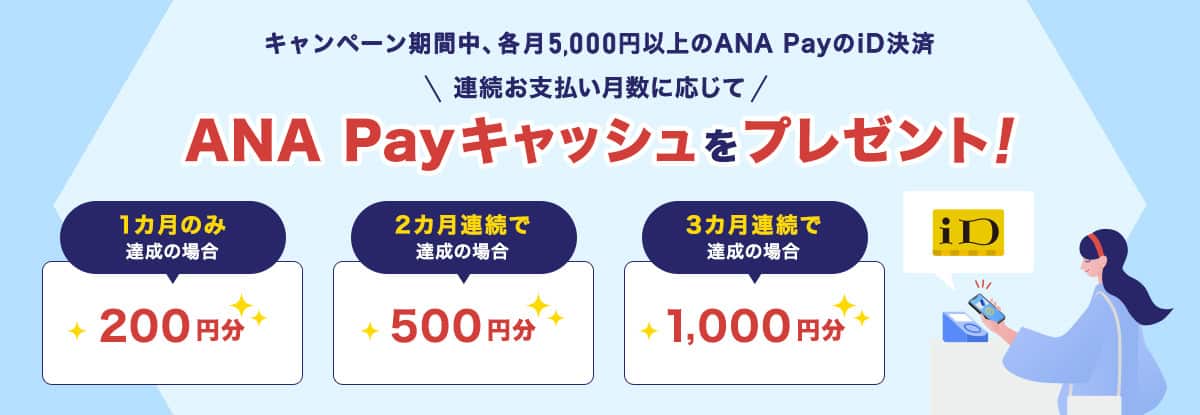 キャンペーン期間中にANA Payに新規登録をし、連続してANA PayのiD決済で、各月5,000円以上決済いただいた方へ、iD決済での連続お支払い月数に応じてANA Payキャッシュをプレゼントいたします。