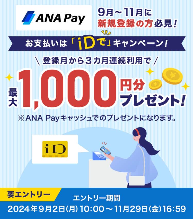 | ANA Pay新規登録期間 | 2024年9月2日(月)00:00~11月29日(金)23:59 |