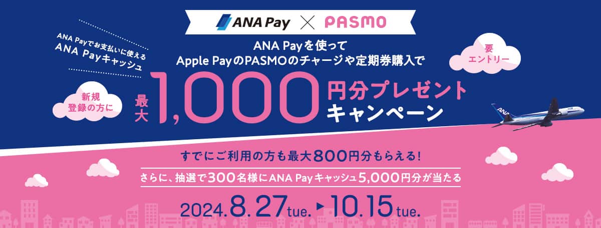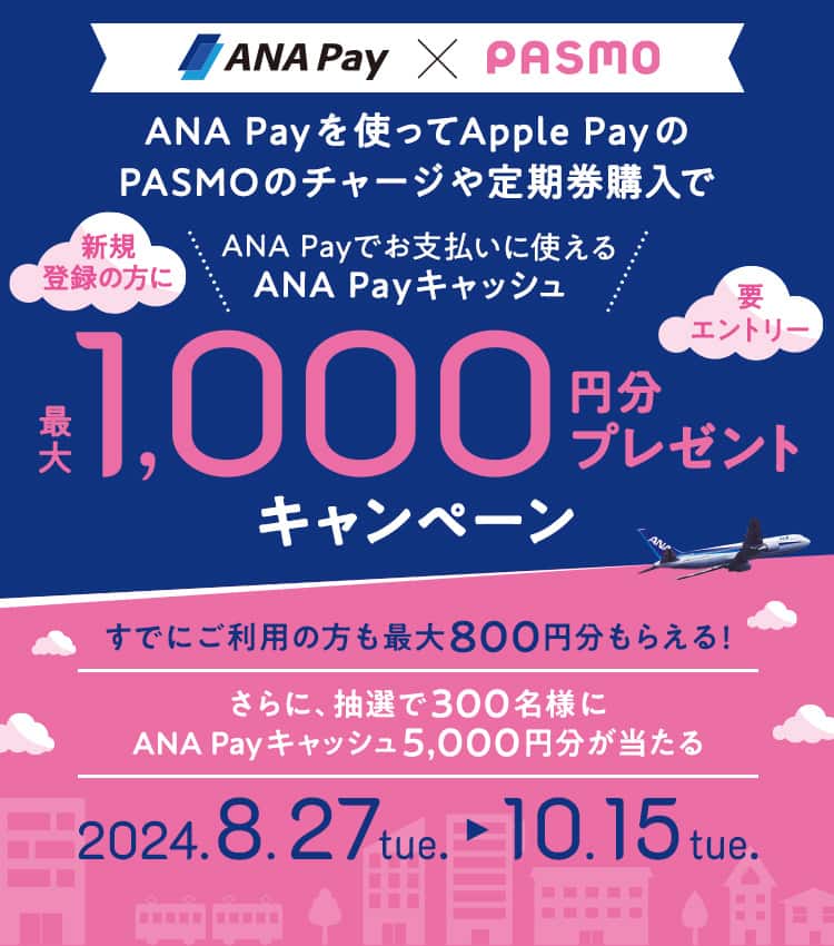 キャンペーン期間中に、Apple PayのANA Payバーチャルプリペイドカードを使って、Apple PayのPASMOのチャージや定期券購入された方に最大1,000円分のANA Payキャッシュをプレゼントいたします。