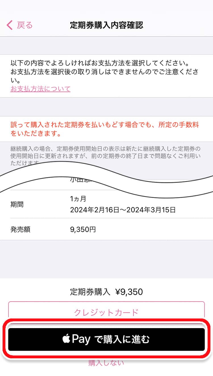 PASMOアプリ上で購入時に「Apple Payで購入に進む」をタップ