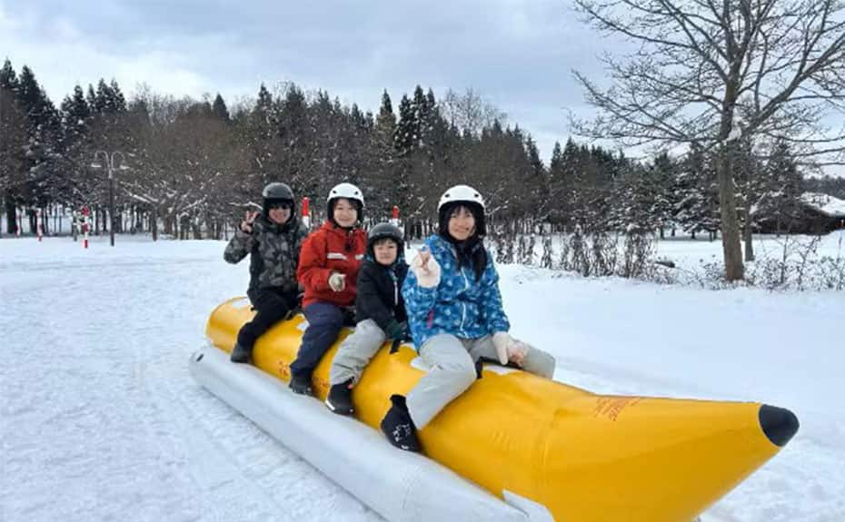 白銀の北欧の杜公園でスリル満点のバナナボート体験!雪原を疾走する爽快感と笑顔あふれる冬のアクティビティで、家族や友人と楽しい思い出を作れます。