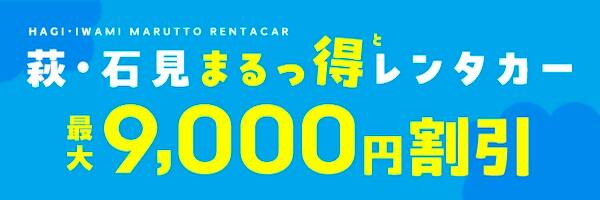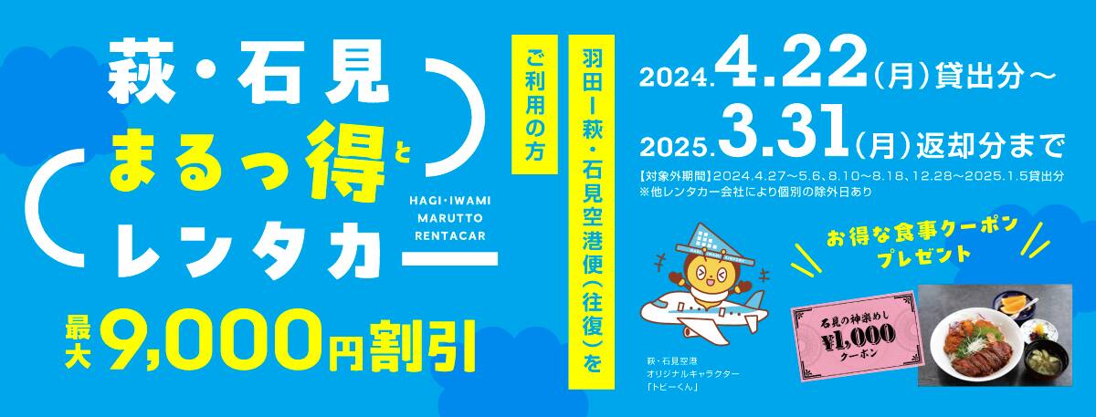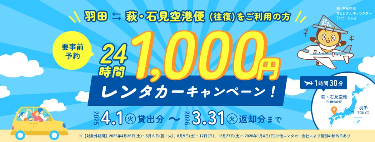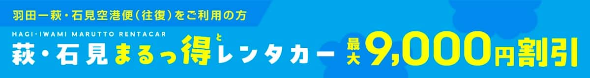 2名以上で萩・石見空港(羽田線)を往復利用、かつ島根県内の宿泊施設に1泊以上ご宿泊すると最初の24時間までレンタカーを1,000円でご利用できます。