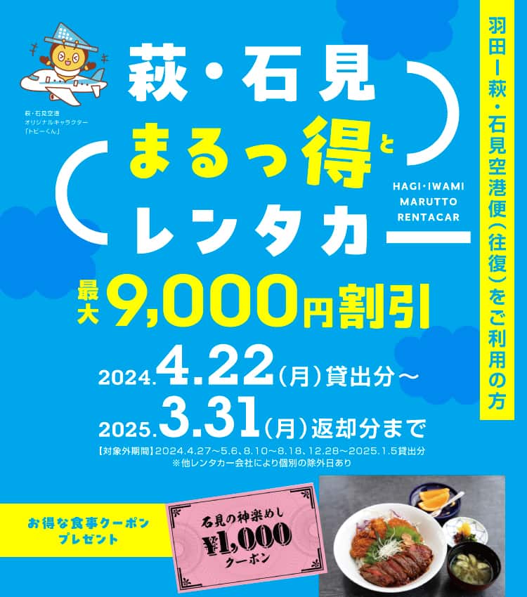 2名以上で萩・石見空港(羽田線)を往復利用、かつ島根県内の宿泊施設に1泊以上宿泊すると最初の24時間までレンタカーを1,000円でご利用可能!