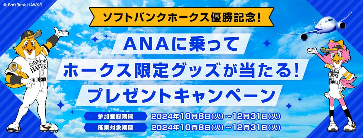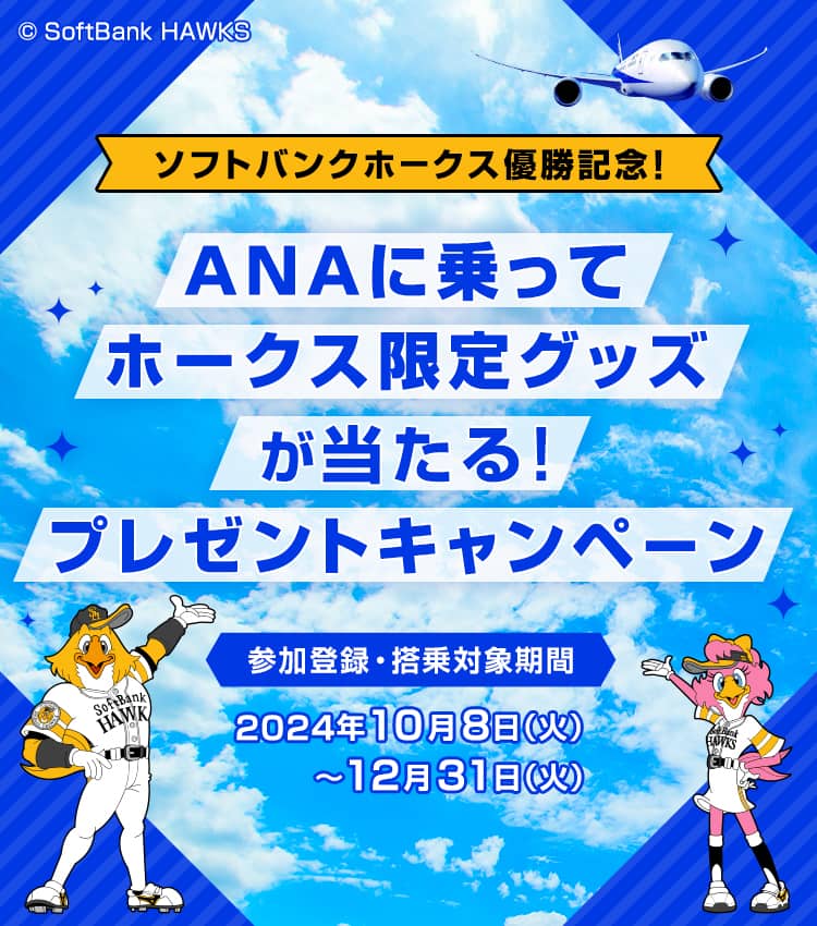 キャンペーン期間中に福岡空港発着のANA便に2回以上搭乗し、参加登録いただいたANAマイレージクラブ会員から抽選で選手サイン入りレプリカユニフォームやANA|ソフトバンクホークス限定グッズをプレゼント