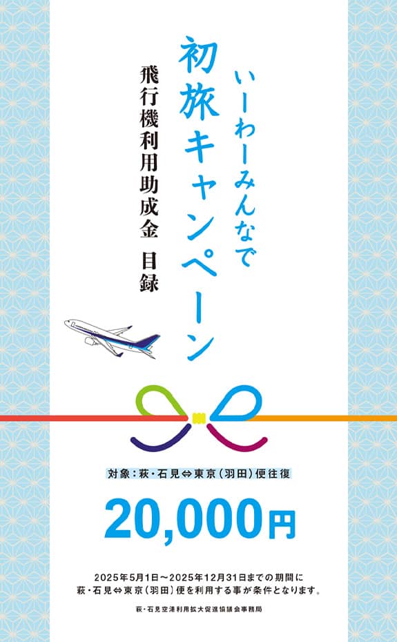 2025年5月1日~2025年12月31日の間に萩・石見⇔東京便往復をご搭乗後に、20,000円をお受け取りいただける助成金目録です。