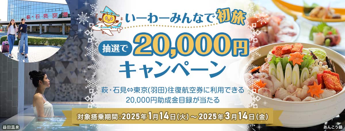 キャンペーン期間中に、ANA萩・石見⇔東京(羽田)線をマイル積算可能運賃にて2区間以上ご搭乗いただいたANAマイレージクラブ会員様の中から抽選で、次回の航空券購入時に使える、萩・石見⇔東京(羽田)便往復 20,000円助成金目録を30名様にプレゼント!