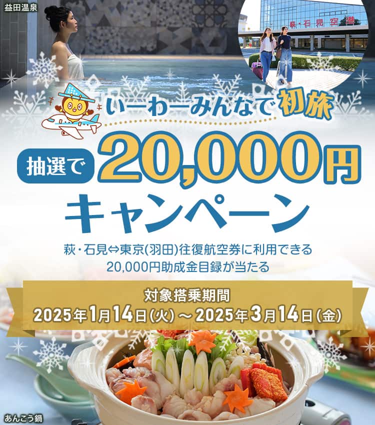 キャンペーン期間中に、ANA萩・石見⇔東京(羽田)線をマイル積算可能運賃にて2区間以上搭乗し、かつキャンペーン参加登録をされた日本地区在住のANAマイレージクラブ会員のお客様の中から抽選で、次回の航空券購入時に使える、萩・石見⇔東京(羽田)便往復 20,000円助成金目録を30名様にプレゼントいたします。
