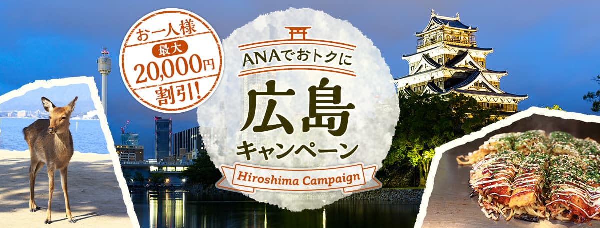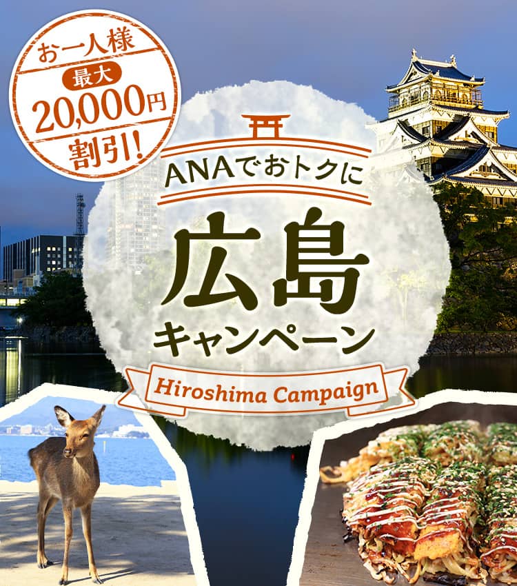 お一人様最大20,000円割引クーポンをご用意!アンケートに答えてもらえる、ダイナミックパッケージ(航空券+宿泊)で使えるクーポンで、この機会におトクに広島へ行こう!