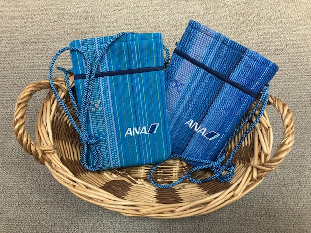 石垣島のみね屋工房が創始織元の伝統工芸品「花織みんさ」のポシェットにANAのロゴを刺しゅうしたオリジナルグッズです。(写真はイメージです)