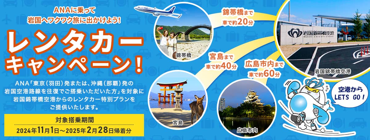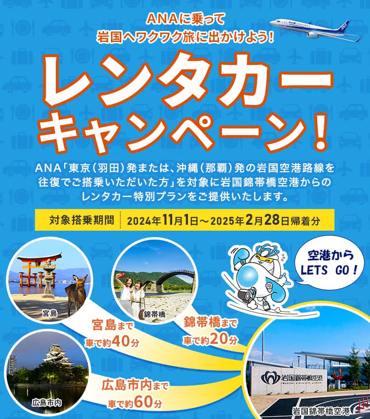 レンタカー専用プラン予約期間中に、ANAトラベラーズレンタカーよりご予約をいただき、東京(羽田)発または、沖縄(那覇)発の岩国空港到着便を往復利用いただいて岩国空港へお越しいただいたお客様