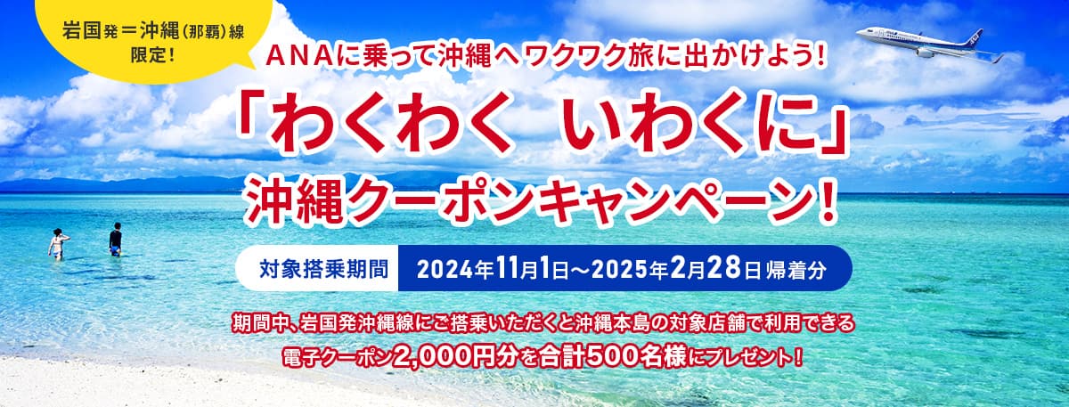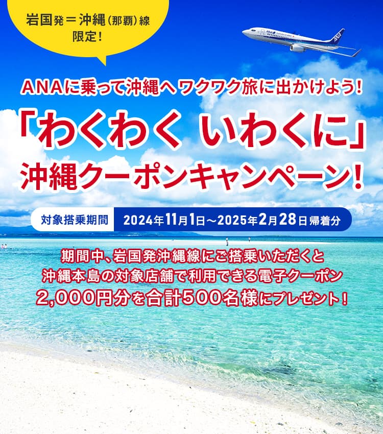 2024年11月1日(金)~2025年2月28日(金)の期間中、岩国発沖縄(那覇)線を片道または往復ANA便でご利用いただいた方に沖縄本島の対象店舗で使用できる電子クーポン2,000円分を合計500名様にプレゼント!