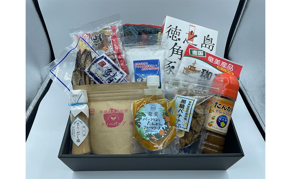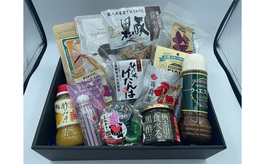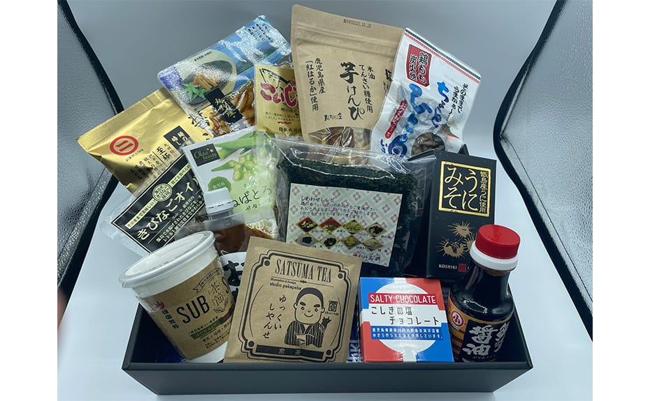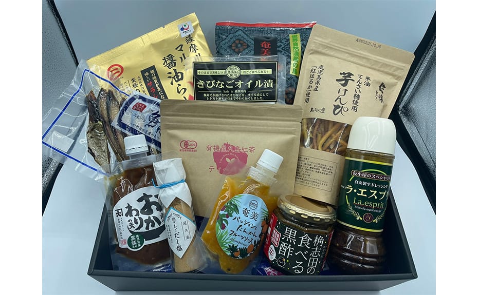 鯖スモーク、奄美のパッション&たんかんフルーツソース、焼きあごだし塩、奄美かりん糖、さつまおかわりの素 黒豚みそ、マルニ醤油ラーメン、芋けんぴ、有機屋久島紅茶、きびなごオイル漬(柚子こしょう)、ラ・エスプリ生ドレッシング、食べる黒酢(ちょい辛)