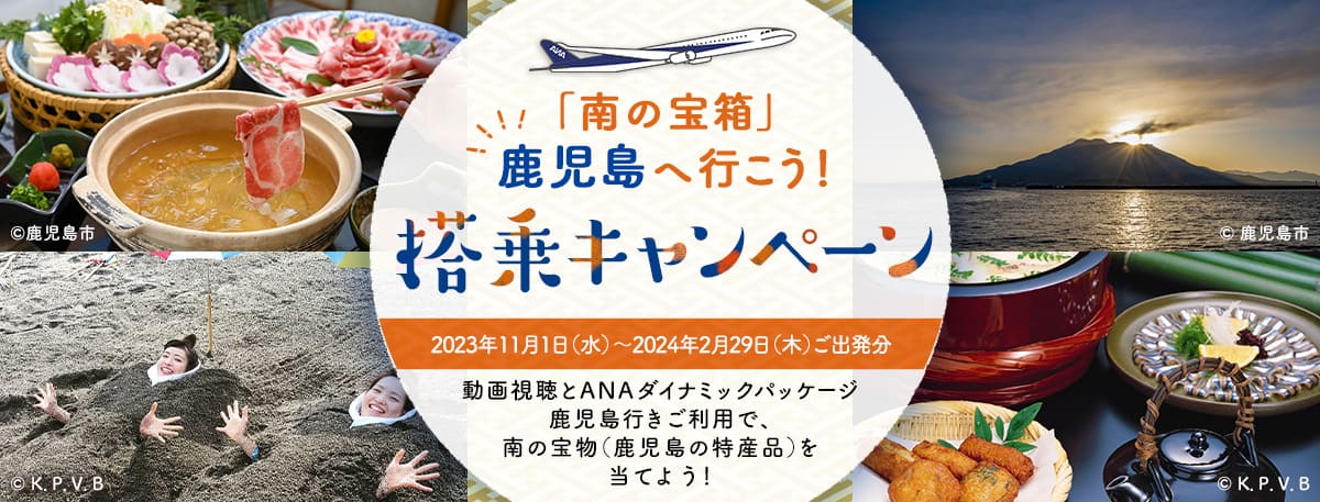 鹿児島の観光PR動画を視聴しキーワードを入力、キャンペーン登録のうえ、各地(東京(羽田)・名古屋(中部)・大阪(伊丹)・沖縄(那覇))発鹿児島行きの対象ツアーを利用したANAマイレージクラブ会員の中から抽選で鹿児島の特産品をプレゼント!
